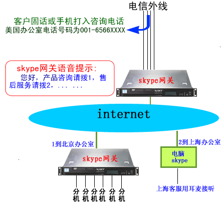 客户拨打美国公司的电话号码001-6566XXXX,即可听到skype网关的欢迎词;“您好,请拨分机号码,产品咨询请按1,售后服务请按2… …”。客户按1后,北京办公室的电话即开始振铃,直接接听即可,完全免费。