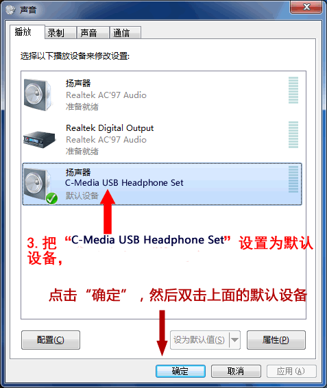 第三步:弹出新窗口,把“扬声器C-Media USB Headphone Set”设为默认设备,然后双击此默认设备。(见图2),